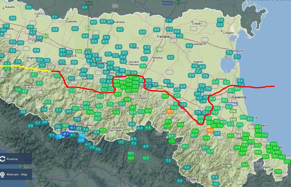 Da segnalare, a quest'ora, già i +15,2°c di Cerasolo Ausa (RN) in pianura ed i +12,3°c a Lodolone (RA) in collina, ad un "passo" da casa mia (comunque tutte le zone collinari emiliane romagnole registrano temperature simili).