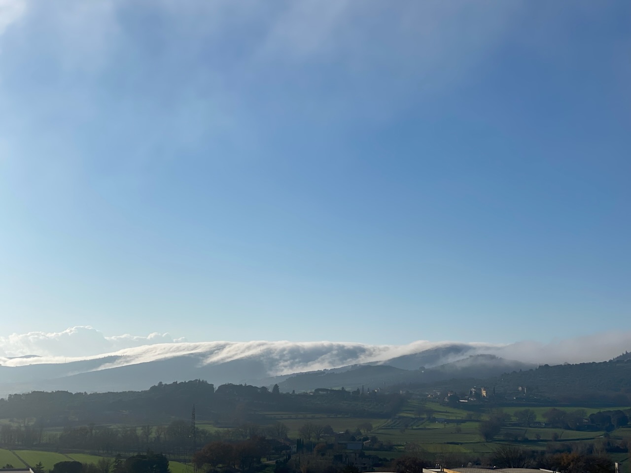 Nebbia che si è diradata da poco in zona. In realtà qua nella vallata non c’è più ma permane nebbia su Corciano e verso il lago. Situazione inconsueta e particolare, senza dubbio atipico.
