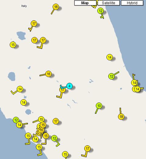 Situazione termica Italia Centrale alle ore 19. Fonte Weather Underground. Mi baso spesso su queste mappe, le uniche che danno la situazione in tempo reale del nostro paese..