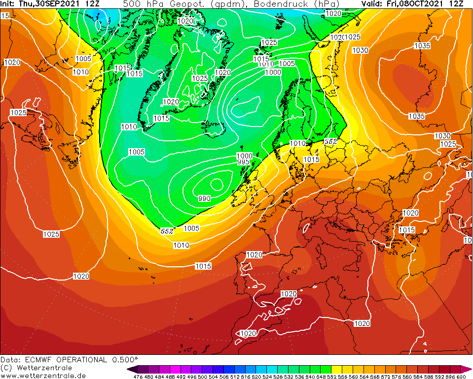 Intanto leggera instabilità nel fine settimana, buona solo per locali piovaschi fortunati. Per domenica esteso fronte freddo che va dal largo del Marocco alla Norvegia.