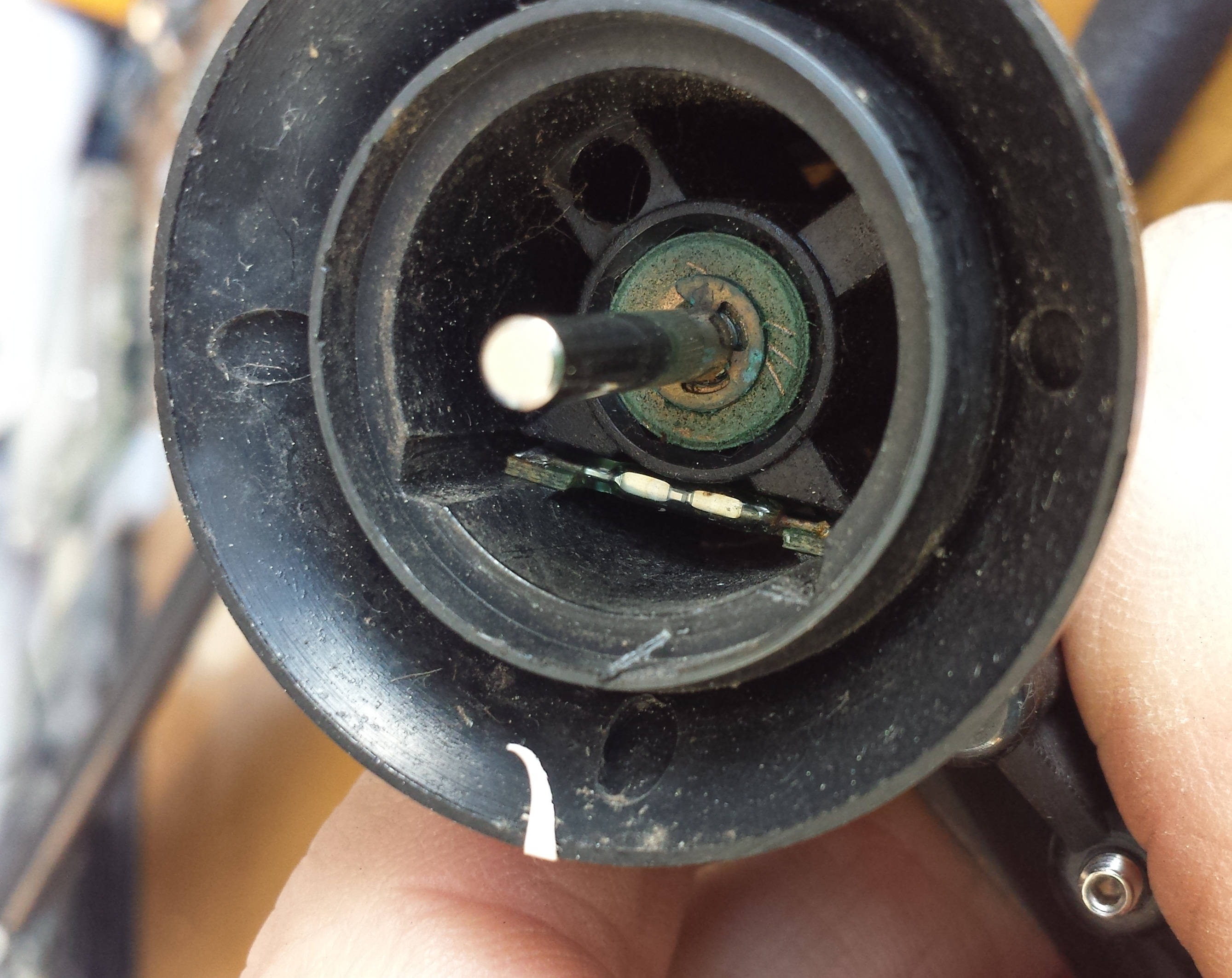 Rimosso il blocco porta coppette, si notano il reed relè ed il perno. In questo esemplare il perno in acciaio inox ruota in un piccolo cuscinetto posto internamente al blocco, mentre nella parte esterna, quella più vicina alle coppette, in una bronzina.