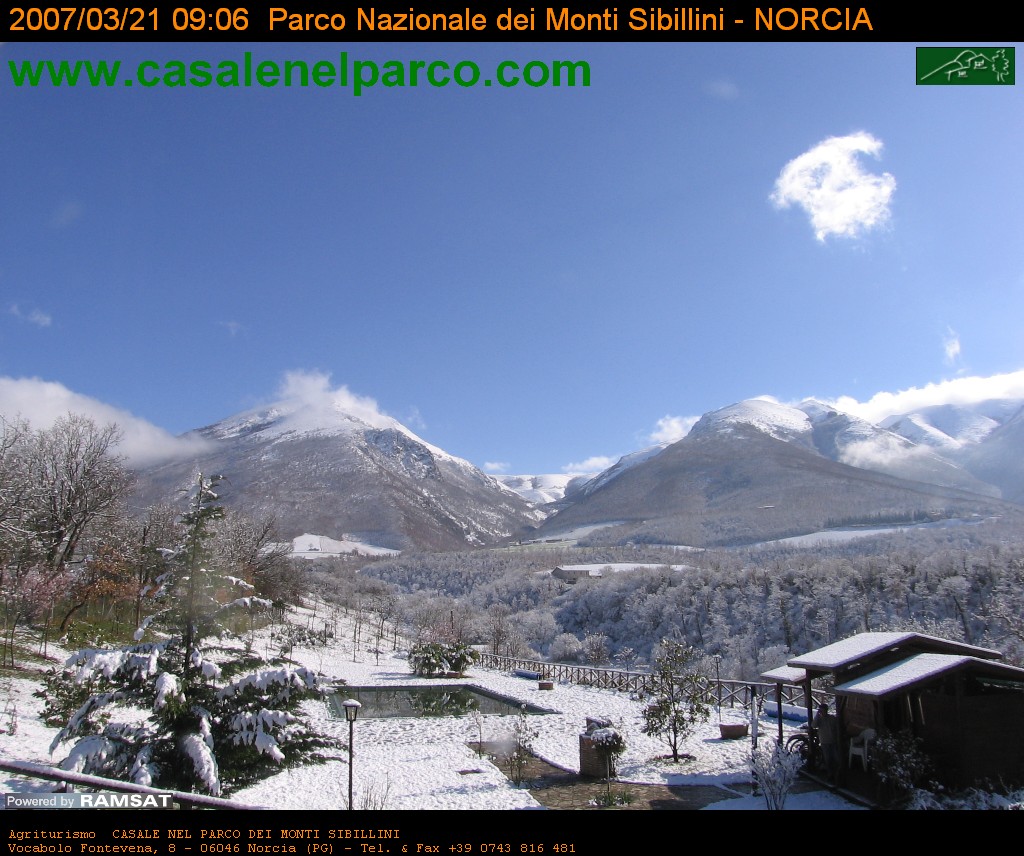 Cielo nuvoloso continua a cadere un pò di neve ma nulla d'importante!!Min. 0.2°. Accumulo di qualche cm sui prati fuori le mura di Visso e circa 25 cm da 850-900 mt.