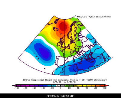 L'Atlantic Ridge si vede bene dalla disposizione delle SLP, è un contesto in cui le anomalie da WR1 sono deboli ancora, ma allargando la finestra temporale tutto è più chiaro. Qui il mean 1-20 giugno 2014: