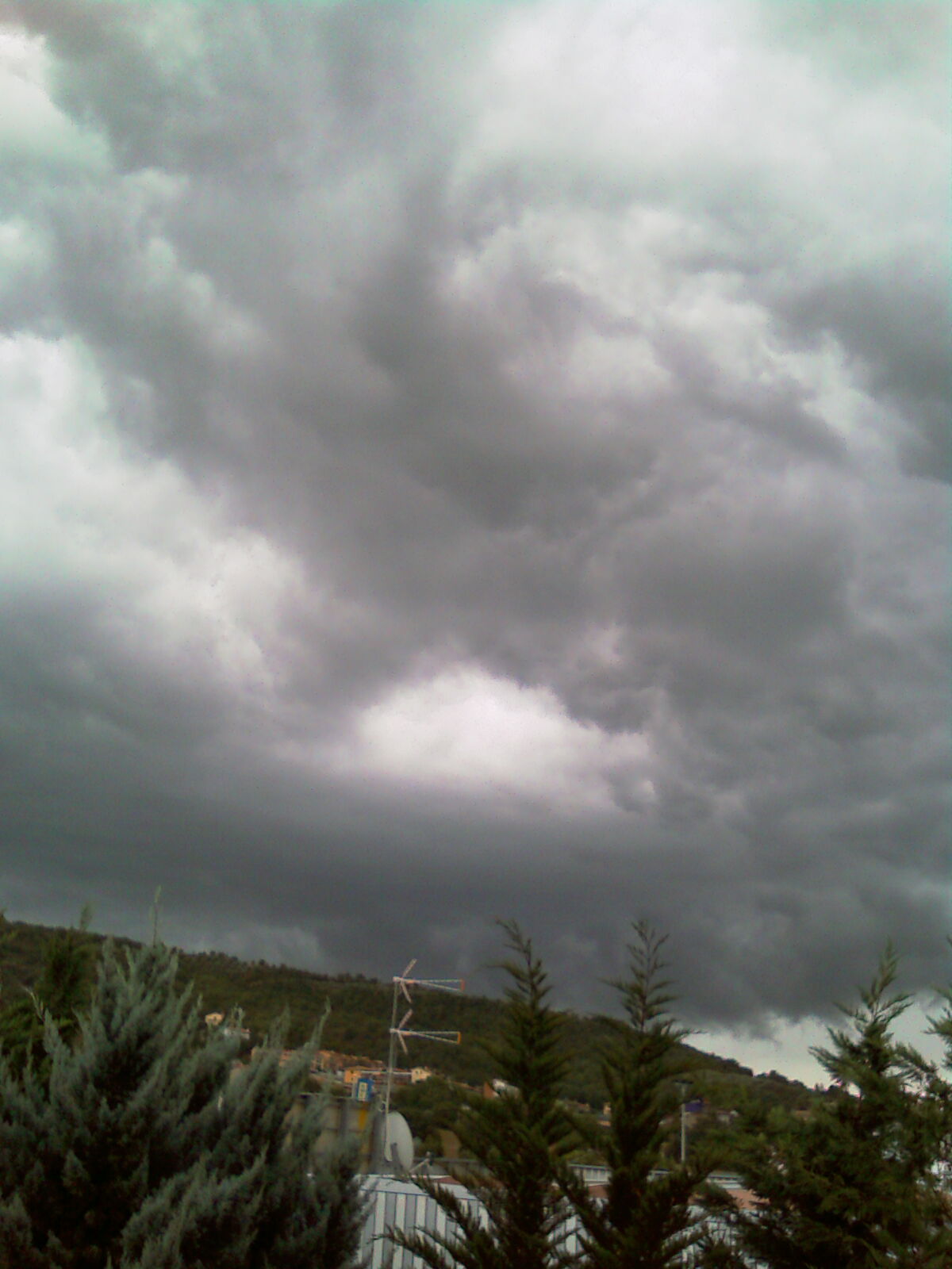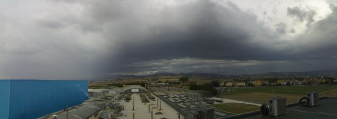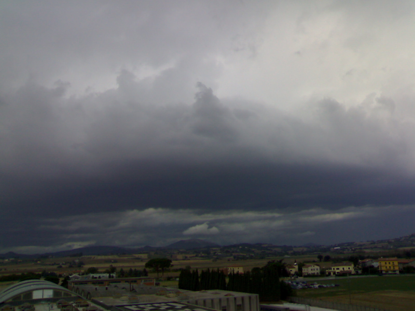 Aggiornamento da Perugia. Vento a raffiche, temperatura scesa quasi di colpo. Verso Pietrafitte nubi basse che in due-tre punti stavano quasi per toccare terra, quindi ci manca poco che si formava una tromba d'aria. Ecco la foto, è di 10 minuti fa. Il grosso ora, sembra arrivare da N-E.