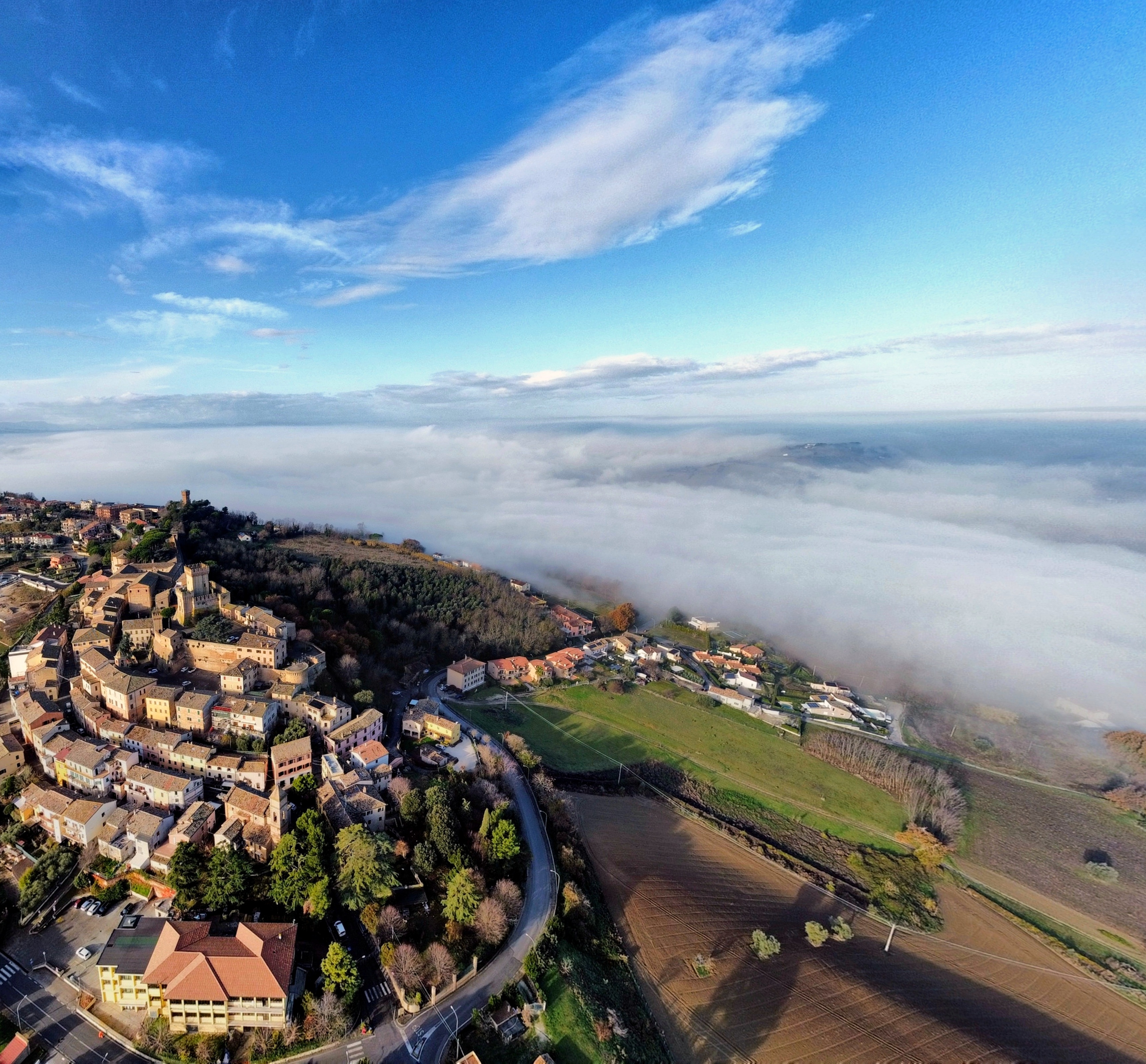 Scatto aereo (drone) dal borgo di Offagna, a pochi km dal mio paese, circondato dal mare di nebbia