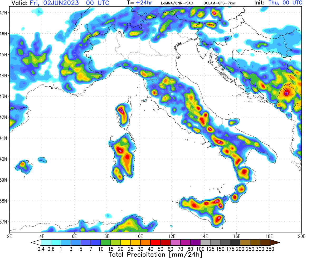 Nel comparto mediterraneo permane quindi instabilità ad oltranza, frutto della circolazione atmosferica generale ormai attivatasi da parecchio tempo nell'area mediterranea, con molte zone interne interessate da temporali da N a S a sviluppo prevalentemente diurno, non tralasciando tuttavia episodi anche in zone marittime. Considerando la situazione barica, non sembrano delinearsi basse pressioni strutturate, con possibilità di nuove estese precipitazioni. Almeno questo, dopo le recenti alluvioni, può ritenersi un fatto positivo non scontato.