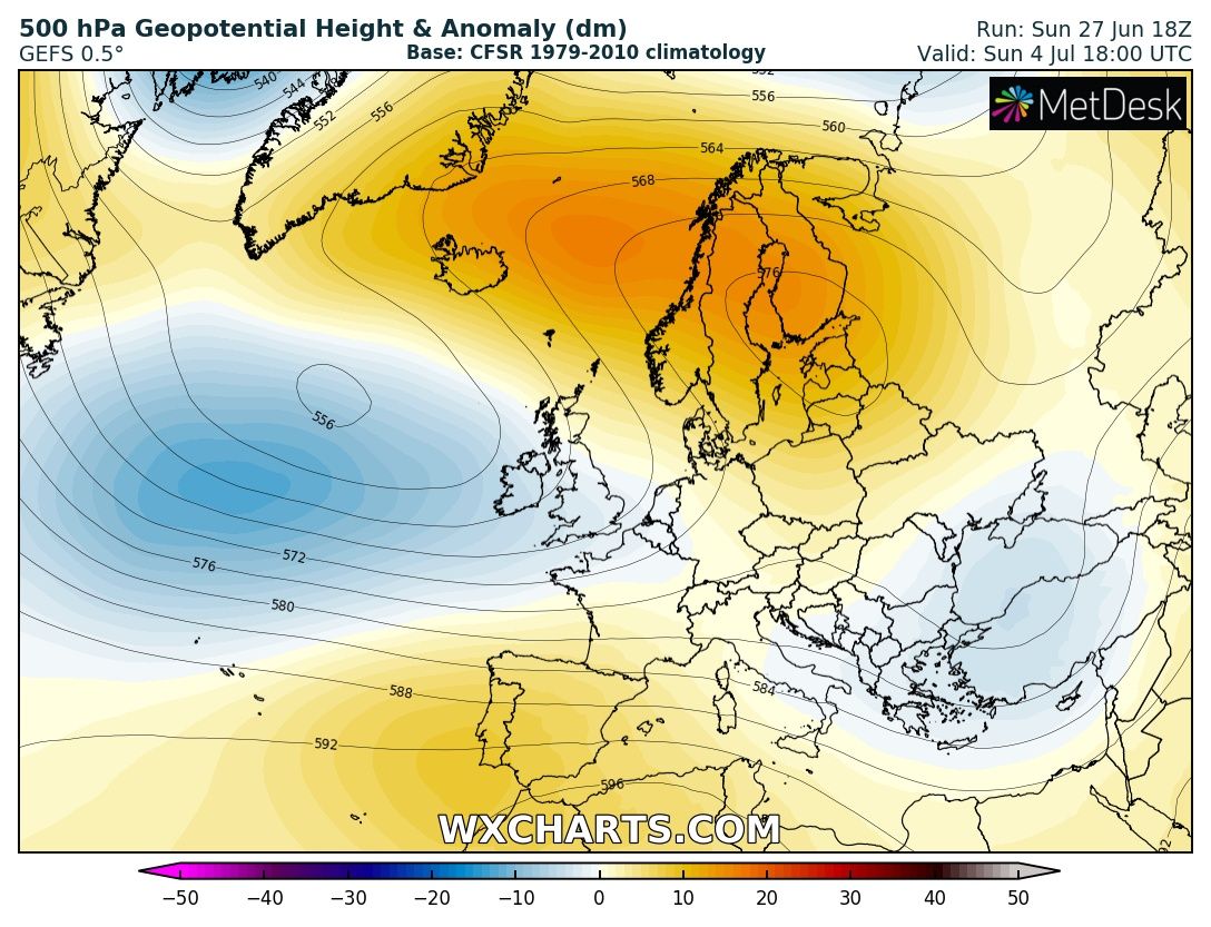 Dopo rapido sguardo , direi che i modelli stanno virando verso uno degli scenari prefigurati: insomma, superati i prossimi 2 giorni, scanseremo almeno per un po' l'Africa pura e dopo una fase di interazione tra cut-off ex-Biscaglia e discesa di aria artica dal bordo est della cella altopressoria scandinava (periodo 29-1 luglio), dovremmo vivere una fase più zonale con chiusura del ridge est-atlantico, isolamento della suddetta cella scandinava, "stiramento" azzorriano lungo i paralleli, jet-stream ben tesa a demarcare l'aria polare dalla subtropicale.