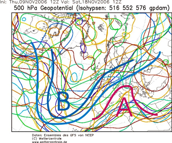 L'alta pressione atlantica presente sull'Europa occidentale ed alimentatata in quota da aria calda, dalla permanente depresisone termica al largo del Portogallo, si allungherà e si collegherà alla nascente alta canadese e groelandese. Il vortice polare troverà la strada spianata alle latitudini meridionali, in questo modo quello che resterà della vecchia alta atlantica non riuscirà ad impedire al vortice polare la sua avanzata verso il Mediterraneo questo perchè la struttura della "vecchia" alta sarà abbastanza snella e poi non sarà più alimentata dall'aria calda in quota della deprssione termica, con deciso spostamento di quest'ultima in pieno oceano.