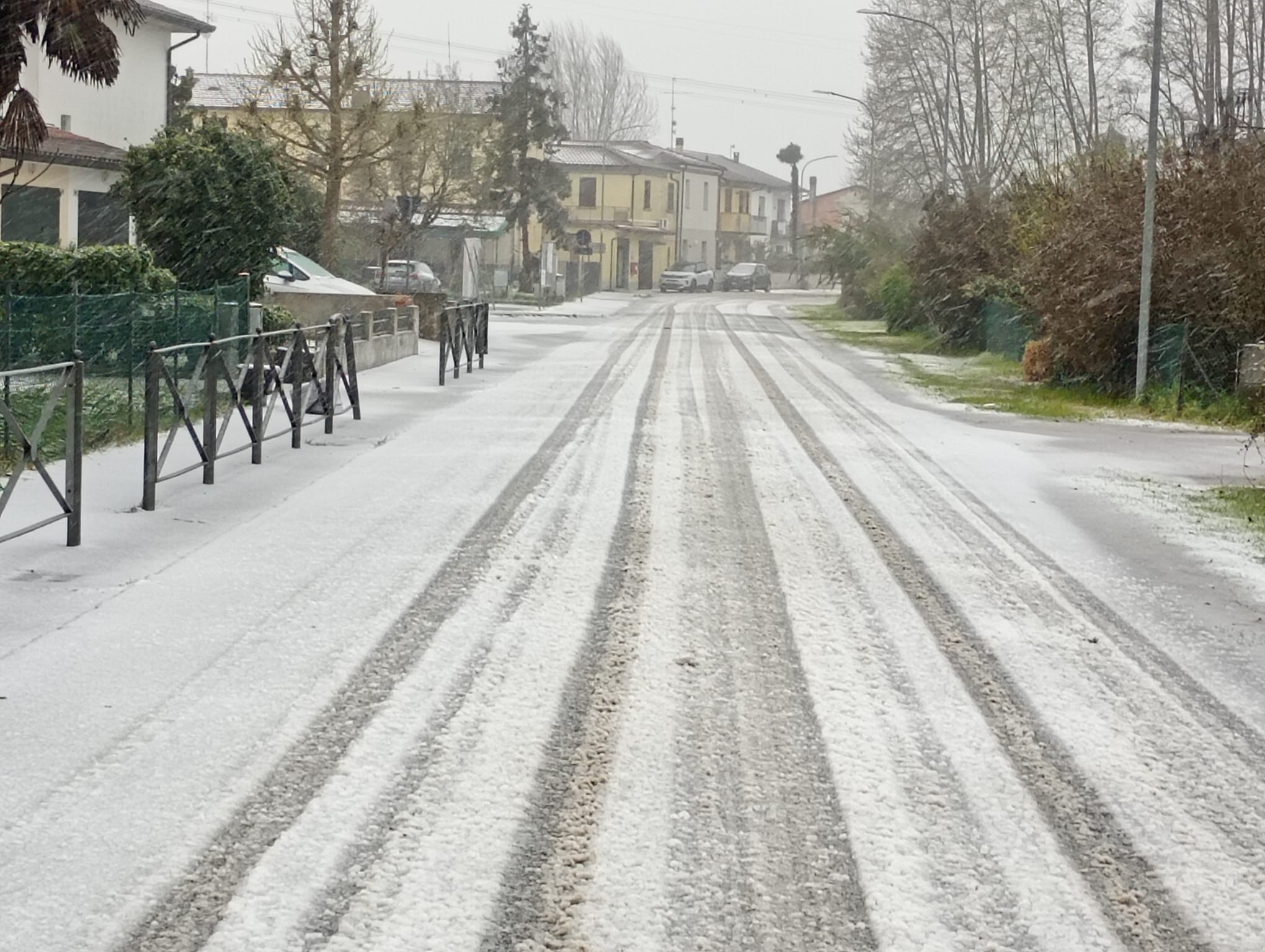 Qui a 420 m. scesi a +1.7° e fiocchi in buona parte, in centro città nevica alla grande e inizia a fare velo bianco sui prati e auto.