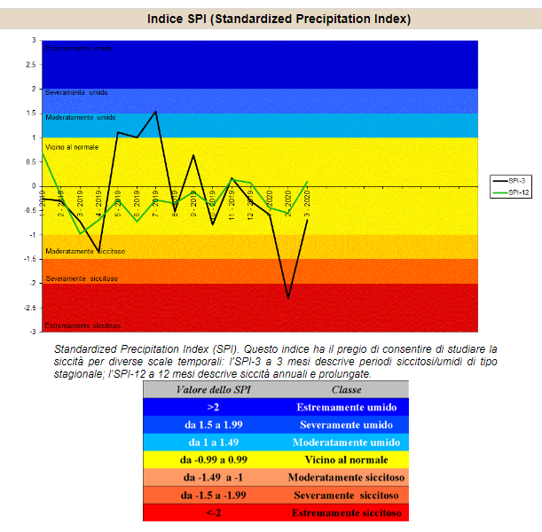 Nella regione Marche viene utilizzato questo parametro (SPI) che sta ad indicare il livello di piovosità, ad ogni scala per mese corrisponde il periodo siccitoso/umido. Marzo al momento riequilibra in parte la situazione, dopo il picco estremamente siccitoso di Febbraio, il mese di Aprile ritorna a mostrare un gravoso deficit, con un 92% (parziale) in meno di precipitazioni..