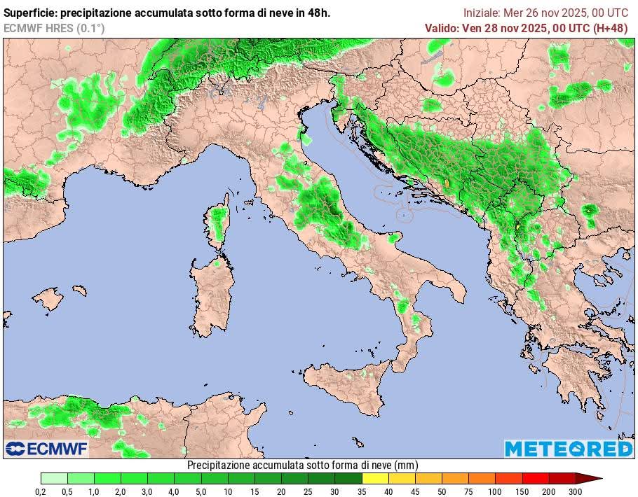 discorso diverso per il lato adriatico, dove le precipitazioni persistenti ed un maggiore afflusso freddo potrebbero consentire nevicate oltre i 4/500 metri, probabilmente senza accumulo. Quelli li vedo difficili sotto i 6/700.