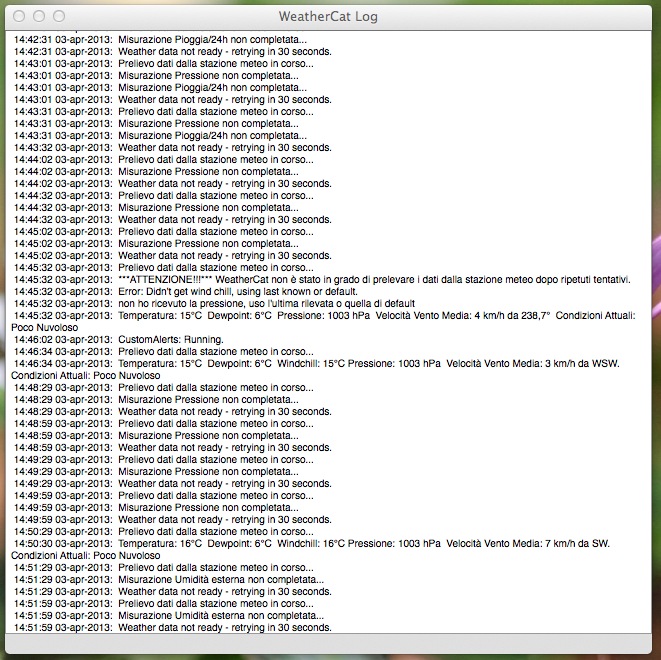 ok sembra che io abbia dei problemi con la comunicazione stazione-pc... a parte il download dei dati, non ancora risolto, controllando la finestra del log di weathercat mi son trovato una serie di errori continui di comunicazione con la stazione, ora non saprei che fare, i driver per il cavo seriale-usb sono ok, la stazione rileva i dati dai sensori, pare però che weathercat faccia fatica a ricevere questi dati....vi allego un istantanea del log....magari qualcuno che ha weathercat sa aiutarmi....anche se so che sono pochi...
