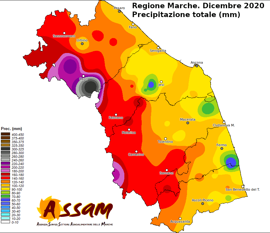 Dicembre è stato un mese veramente ricco di precipitazioni nelle Marche, la fascia appenninica ne ha beneficiato maggiormente; 116 mm il totale medio regionale, corrispondente al 27% in più del cumulato medio mensile (81-10) . Per la temperatura invece registra un'anomalia di +0,7° rispetto alla media 81/10