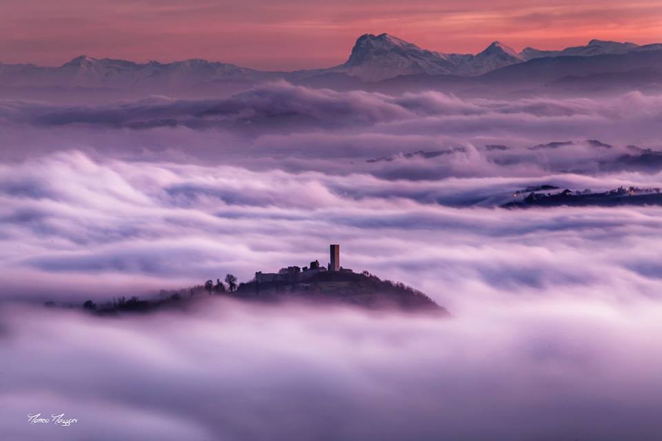 Una spettacolare visione dall'alto, siamo nel maceratese esattamente da San Lorenzo di Treia con la torre di Pitino che emerge tra la nebbia e il Gran Sasso da sfondo...